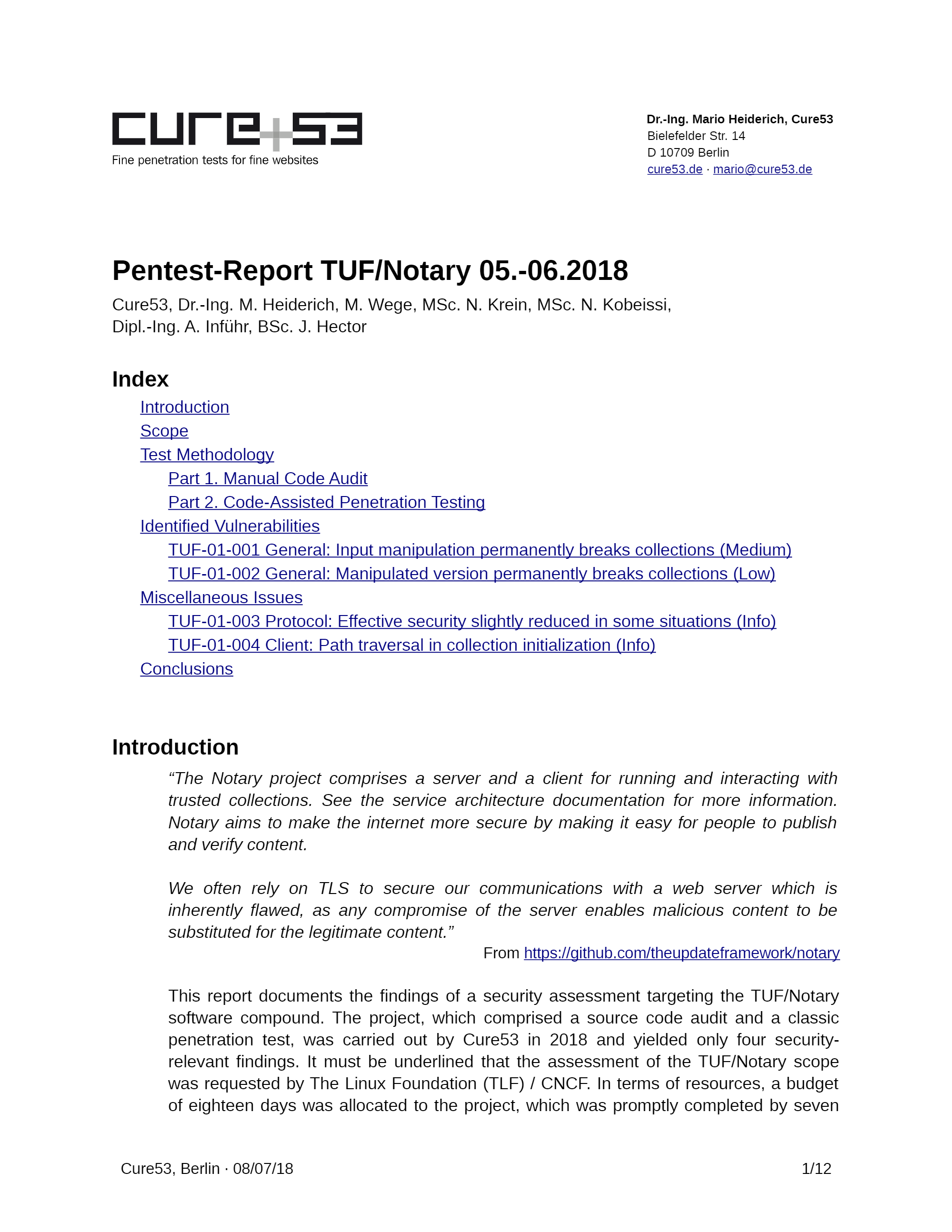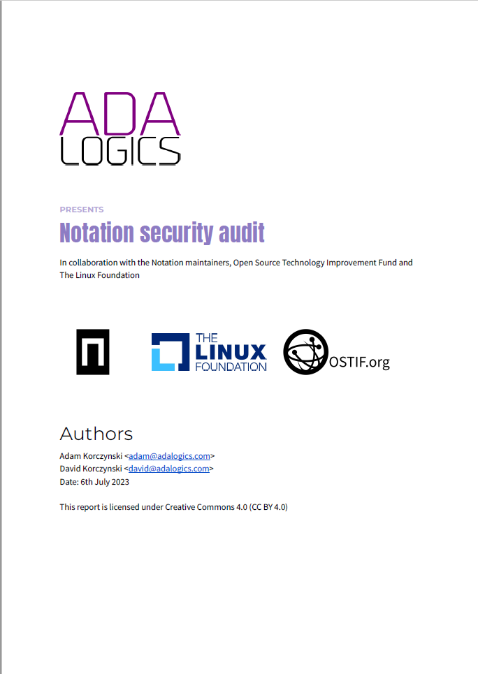 In March and April 2023, Ada Logics carried out a security audit For Notation, Notation-go and Notation-core-go. The audit was a holistic audit involving threat modelling, manual auditing, fuzzing improvements and SLSA compliance review. This report details the findings from the audit.